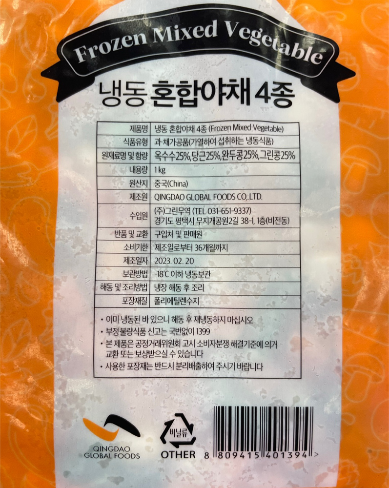 | 품목 또는 명칭 | 외식용)냉동혼합야채(4종)·1kg(옥수수 외)/중국산 |