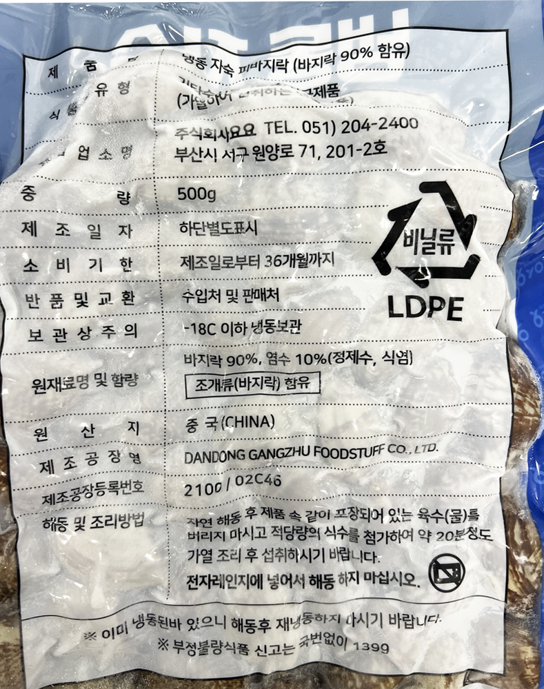 | 품목 또는 명칭 | 냉동 자숙 피바지락(육수포함) 500g/요요 |