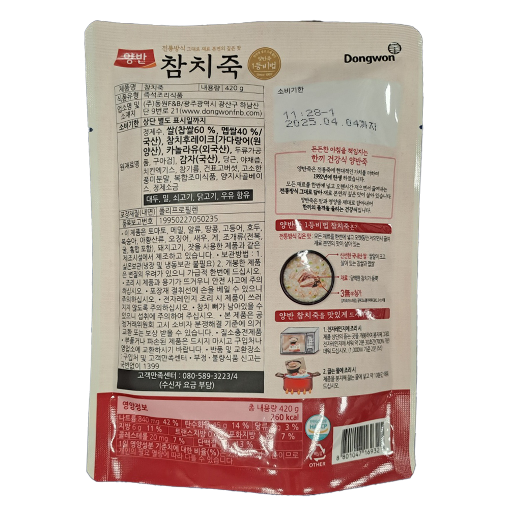 | 제품명 | 양반 참치죽(파우치) 420g /동원F&B |
