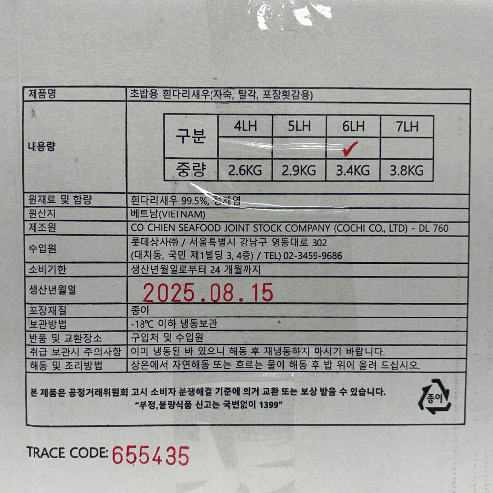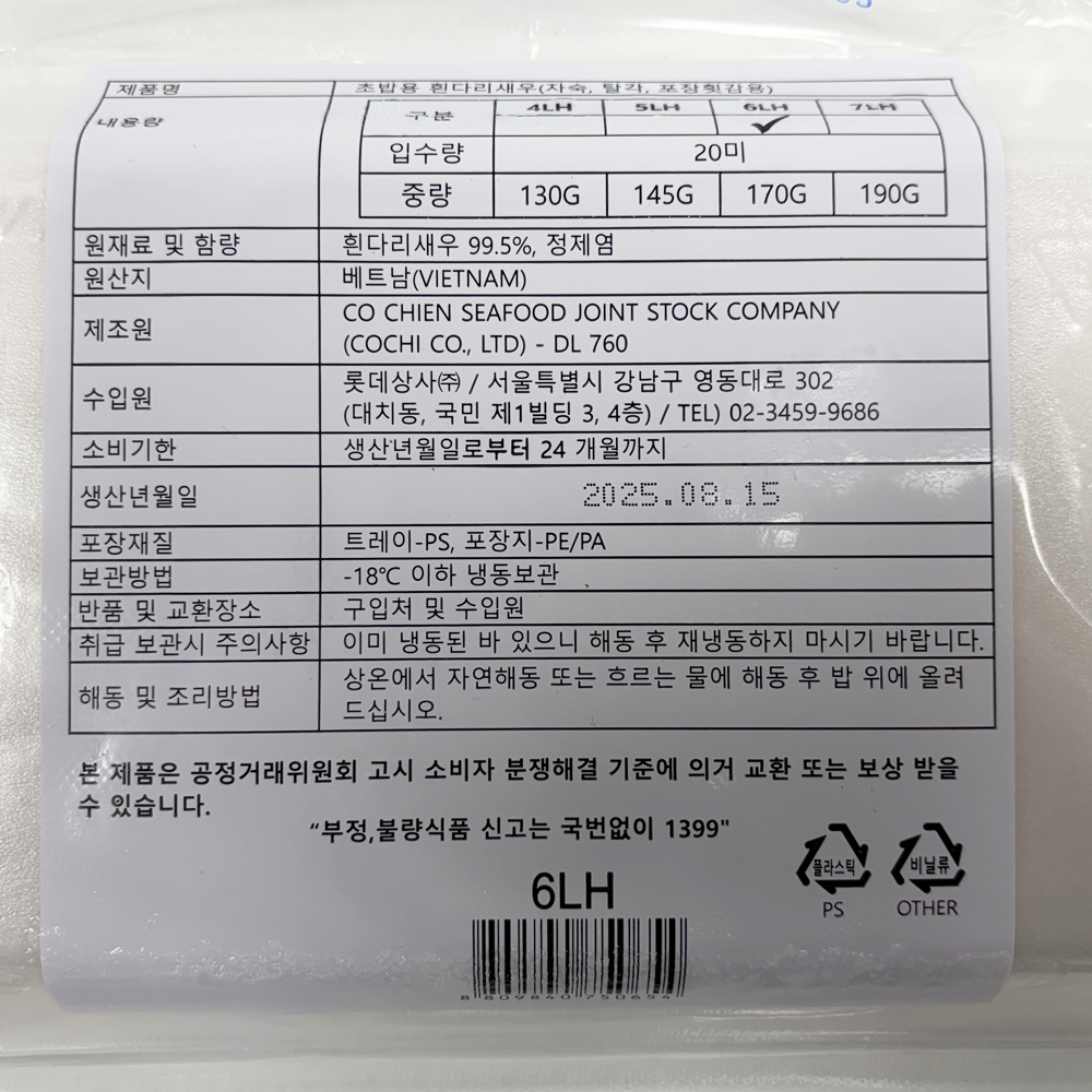 | 품목 또는 명칭 | 초밥용 흰다리새우(목초새우) 6LH 170g/롯데상사 |
