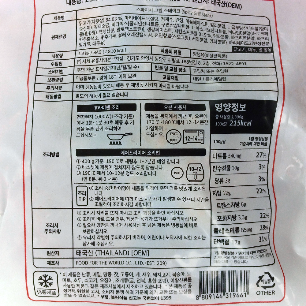 | 제품명 | 스파이시 그릴 스테이크 1.3kg/사세 |
