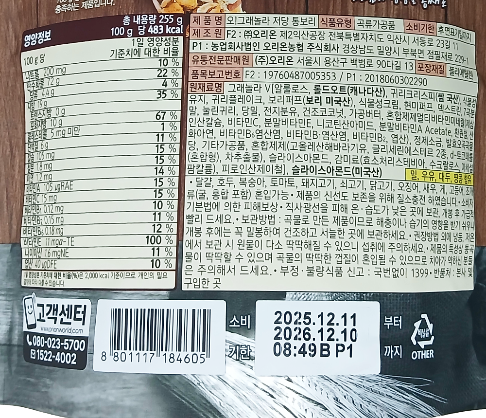 | 제품명 | 오!그래놀라 저당 통보리 255g /오리온 |
