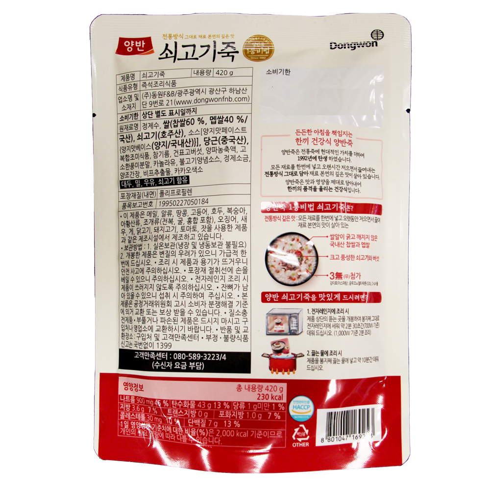 | 제품명 | 양반 쇠고기죽(파우치) 420g /동원F&B |