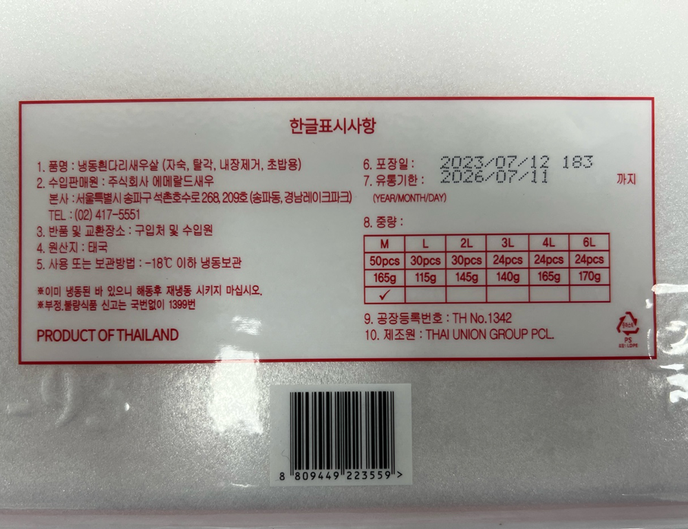 | 품목 또는 명칭 | 냉동 초밥새우 M 160g (흰다리새우살)/다이아몬드 |