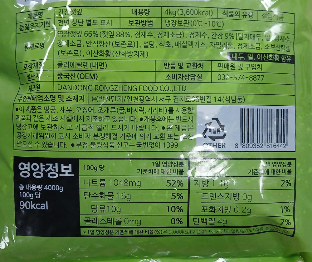 | 제품명 | 씻어담은 간장깻잎 4kg/반찬단지 |