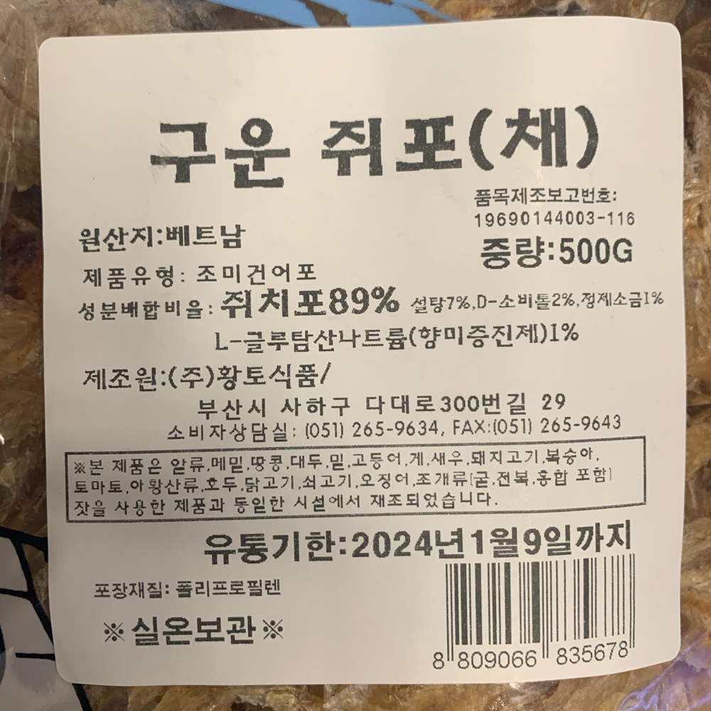 | 품목 또는 명칭 | 구운 쥐포(채) 500g/황토식품 |