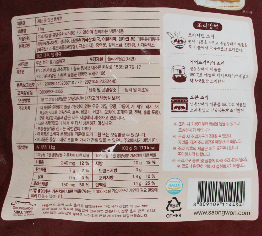 | 원재료명 및 함량(농수산물의 원산지 표시에 관한 법률에 따른 원산지 표시 포함) | 동태포(러시아산), 정제수, 전란분, 대두유, 중력분, 정제소금 등 |