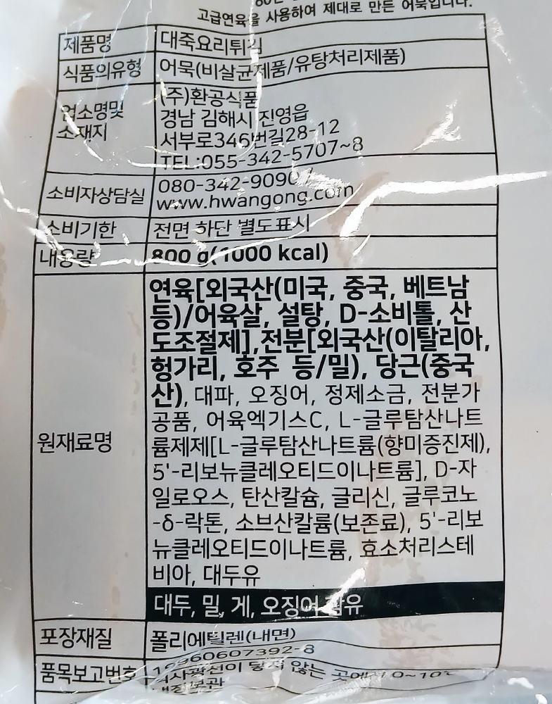 | 식품의 유형 | 어묵(비살균제품/유탕처리제품) |