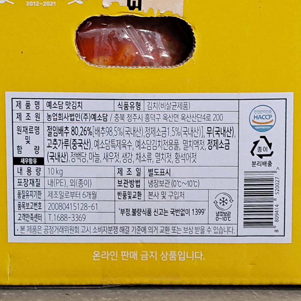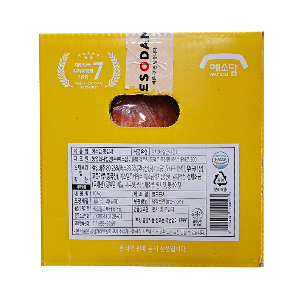 | 원재료명 및 함량(농수산물의 원산지 표시에 관한 법률에 따른 원산지 표시 포함) | 배추(국내산86%),무(국내산),고춧가루(중국산),마늘(국내산),생강(국내산),멸치액젓(국내산),새우젓(국내산),황색어젓(국내산),밀가루풀,쌀풀,정백당,예소담특제육수,L-글루타민산나트륨(향미증진제) |