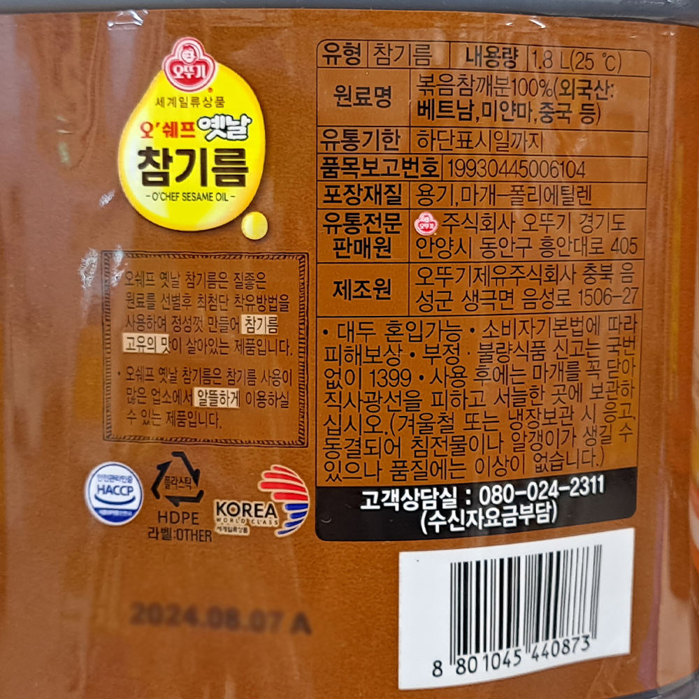 | 제품명 | 오쉐프 옛날참기름 1.8L/오뚜기 |