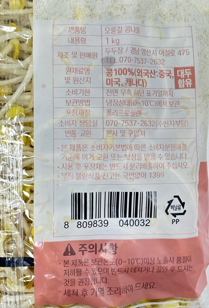 | 품목 또는 명칭 | 신선 콩나물·1kg(원산지:별도표기) |