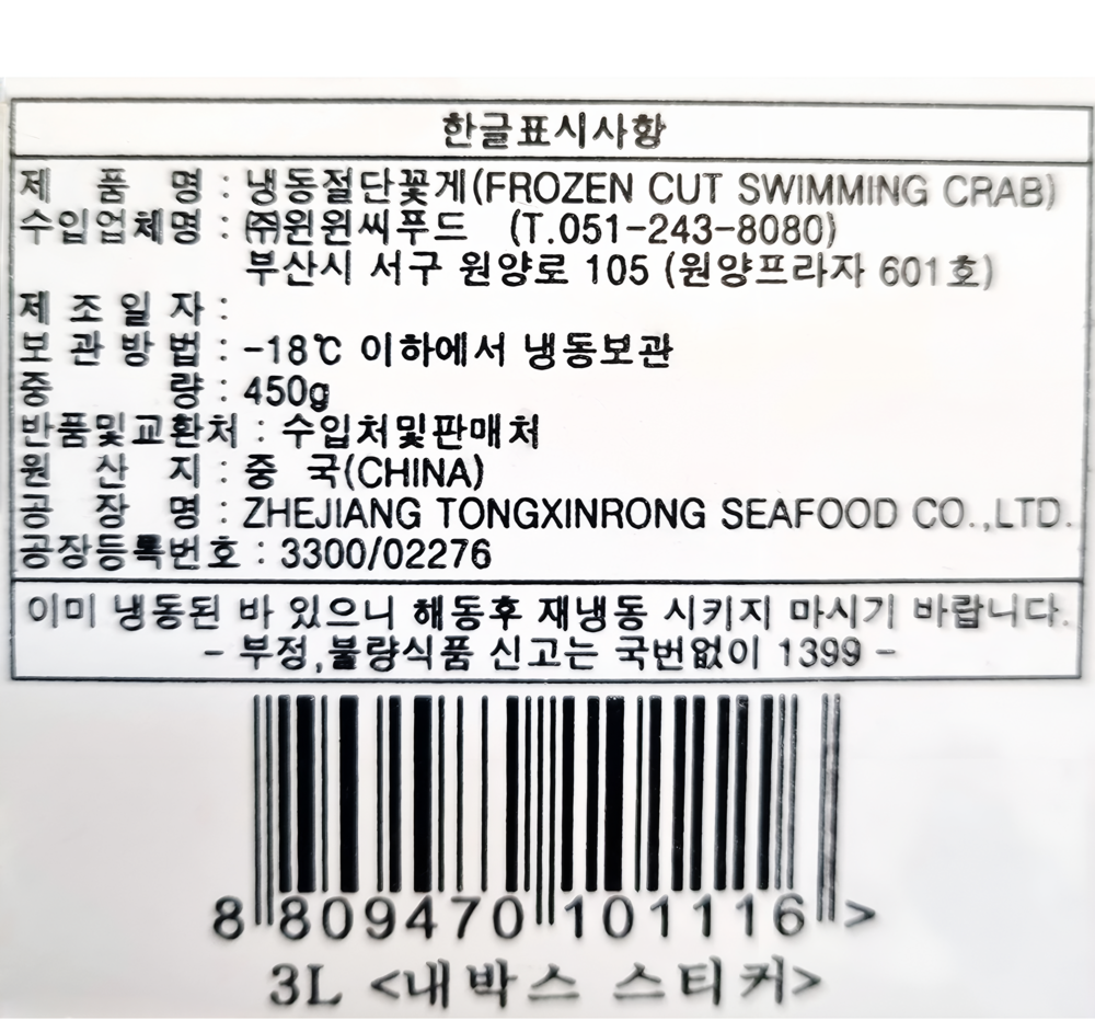 | 품목 또는 명칭 | 냉동절단꽃게 3L 450g(중국산)/부경통상(윈윈) |