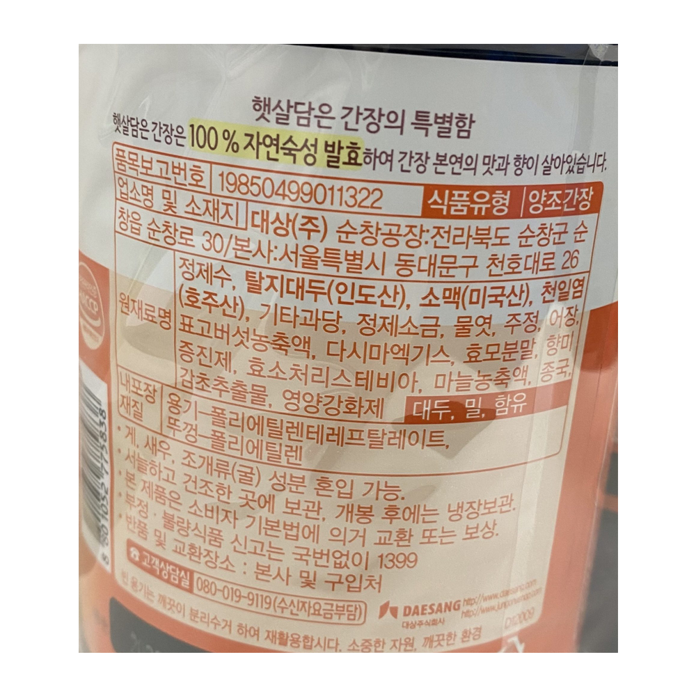 | 원재료명 및 함량(농수산물의 원산지 표시에 관한 법률에 따른 원산지 표시 포함) | 정제수,탈지대두,소맥,천일염,기타과당,정제소금,물엿,주정,어장,표고버섯농축액,다시마엑기스,효모분말,향미증진제,효소처리스테비아,마늘농축액,종국,감초추출물,영양강화제 |