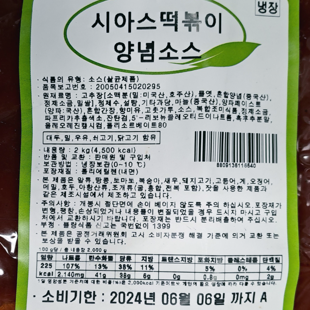 | 제품명 | 떡볶이양념소스 2kg(냉장)/시아스 |