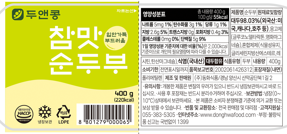 | 제품명 | 두앤콩 참맛 순두부 400g/동화식품 |