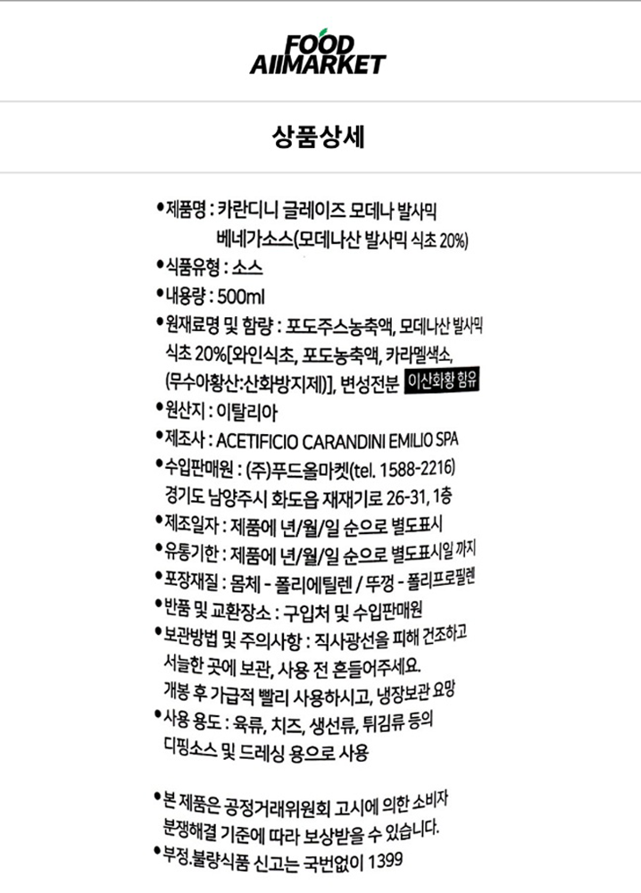 | 생산자 및 소재지(수입품의 경우 생산자, 수입자 및 제조국) | 수입원 : (주)푸드올마켓 제조사 : Acetificio Carandini Emilio S.p.A. |